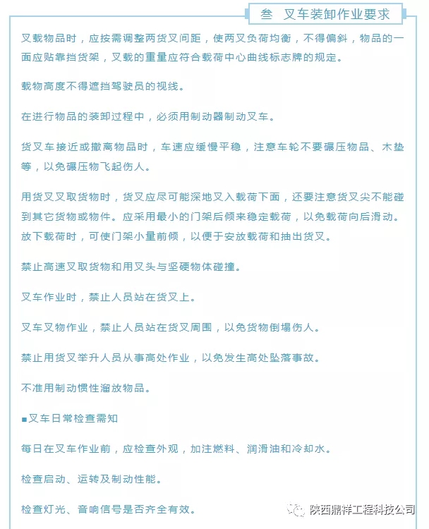 叉車是一種工業(yè)搬運(yùn)車輛,是指對成件托盤貨物進(jìn)行裝卸、堆垛和短距離運(yùn)輸作業(yè)的各種輪式搬運(yùn)車輛,駕駛叉車的人員必須經(jīng)過專業(yè)正規(guī)的培訓(xùn),通過市場監(jiān)督部門的考核,取得特種操作證,并經(jīng)公司同意后方能駕駛,嚴(yán)禁無證操作。鼎祥安全始終銘記所有生產(chǎn)安全都與安全生產(chǎn)培訓(xùn)息息相關(guān),叉車事故層出不窮,其正確操作是所有叉車操作人員及其安全管理員需知道的,一起來學(xué)習(xí)吧!